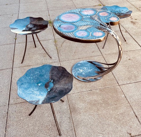 De ses premières passions pour la restauration de véhicules et d’objets anciens, il y a 25 ans; Vincent est aujourd’hui dans la création de mobilier Design, intégrant dans ses réalisations des éléments manufacturés issus du recyclage, mais aussi du bois, de la pierre, de la résine, etc….;